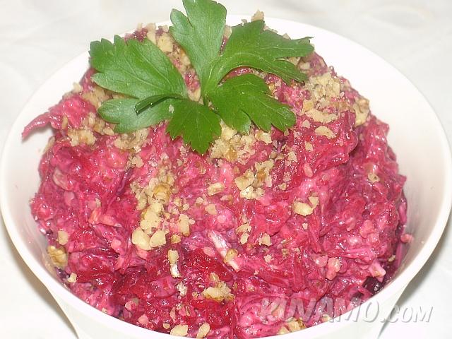 Lepa, ukusna, izuzetno bogata vitaminima salata od cvekle. U ovoj salati su iskombinovani i orasi i beli luk. Jelo može da se spreme i sa posnim majonezom.